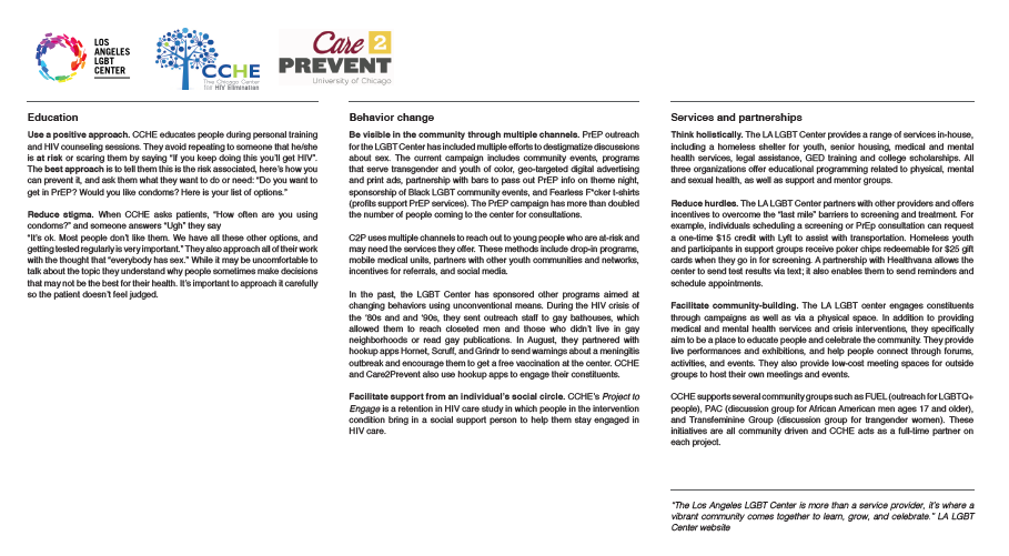 Here's an example of a final case study we provided to the client. In this case, we combined a number of different organizations that were tackling the same issues to create a more robust and thorough analysis of best practices.