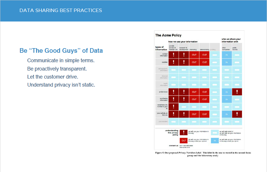 Here is an example of best practices we provided the client under the category "Data Sharing". How can they be the "good guys of data?" What can they learn from organizations such as McGraw Hill about data privacy?